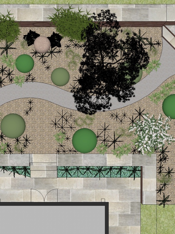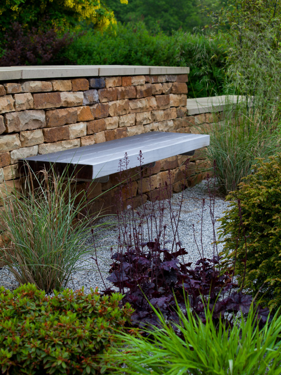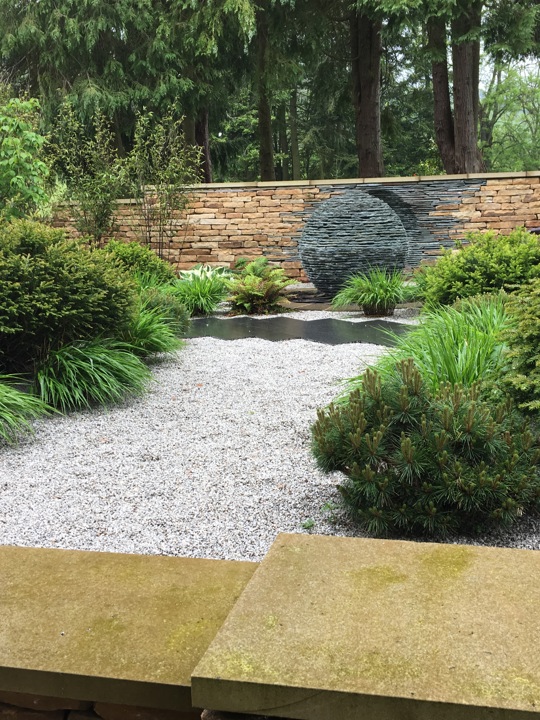 I took what the clients considered the essence of Japanese gardens as my starting point: simplicity, texture, greenery, natural materials and structure. To separate the Japanese influenced area from the rural landscape, the banks around the edge of the garden became dry stone walls, topped with modern, sawn limestone coping, with stone steps leading up and out into the wider landscape. A modern stone path curved elegantly through the gravelled garden, past domes of topiarised yew, bamboos, miniature pine domes, ferns and Japanese Forest Grass to an intimate floating cedar bench. Height was provided by Japanese Acers and Dogwood Trees. The focal point of the garden was a large stone ball, built by a drystone master craftsman, echoing a concave aperture in the wall behind it.