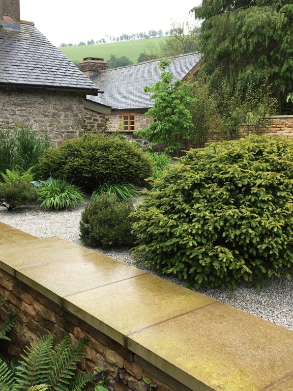 Tucked high up in the South Shropshire Hills, this early Victorian farmhouse had undergone a huge restoration. The clients wanted to develop a damp and shady area immediately outside the rear of the farmhouse. They had previously lived in Japan and liked the idea of a restful garden with a strong Japanese theme, whilst not wanting to instigate a culture clash with Shropshire Victoriana! The garden was a flat area approximately 8 x 16 metres with steep banks on two sides leading up to the rest of the garden.