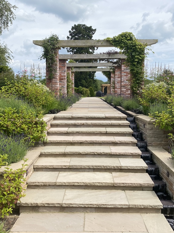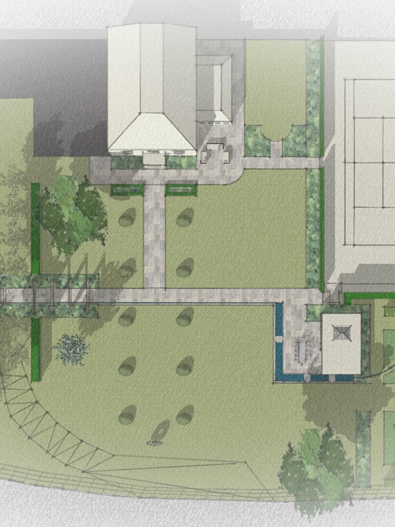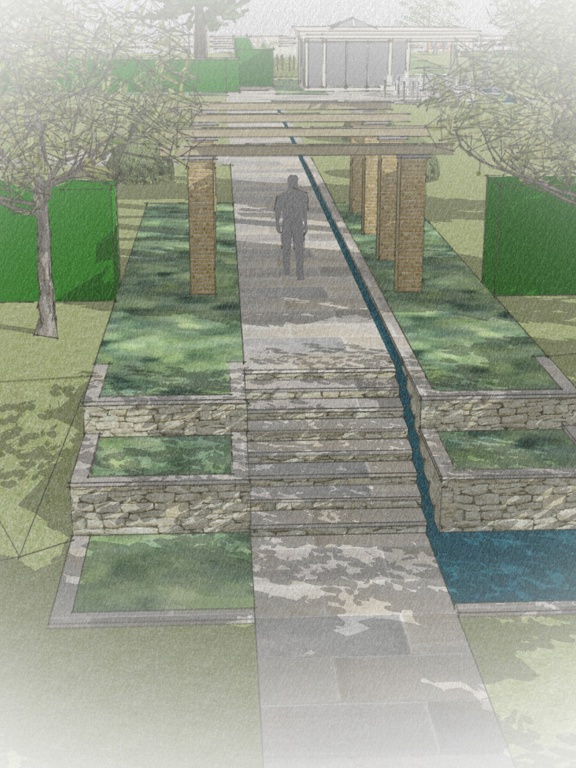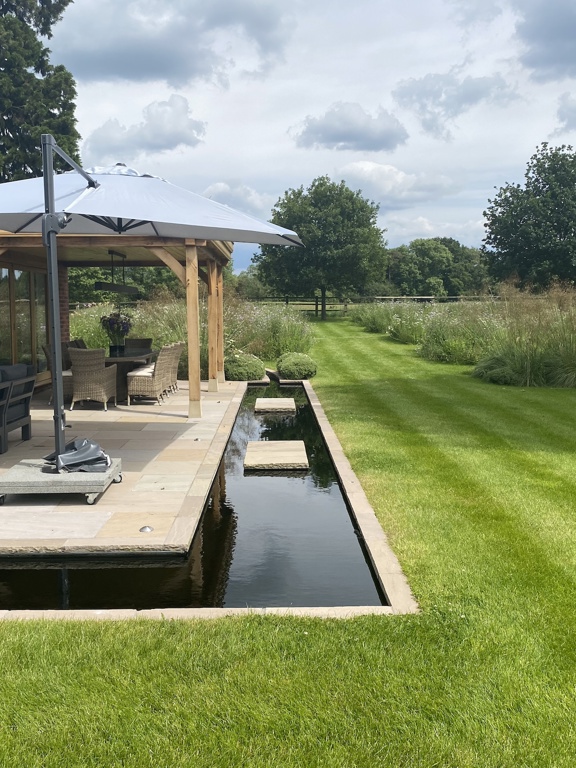The design uses as its main theme a water course running right through the garden and taking a number of forms. The water course rises as a kind of spring at the highest part of the garden in a small circular pool. Then, as a narrow rill, it takes a large sweeping meander through a huge wildflower meadow intersected with cleanly mown paths and dotted with large topiarised Yew domes. The rill empties in an L shaped canal which borders two sides of a large patio housing a garden room with a kitchen and eating area. Stepping stones cross the canal to give access to the lawns. The water course then reverts to a rill, but this time a long and very straight one, running alongside a path that runs down the full length of the garden, passing under a series of rose laden pergola arches and heavily planted herbaceous borders. It then tumbles down a series of steps, finishing its journey in another pool.