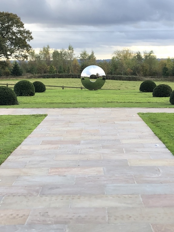 The views out from the house look across the rill, the eye led down an avenue of large topiary Yew domes to a striking piece of modern sculpture which reflects the garden and the huge skies back towards the house.