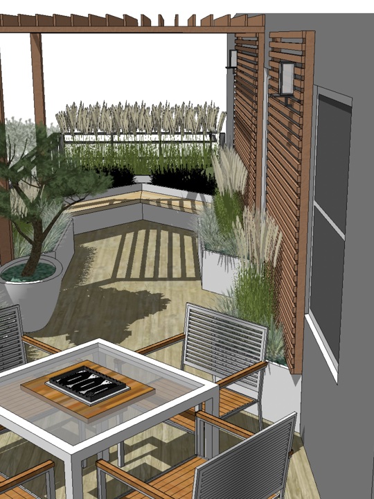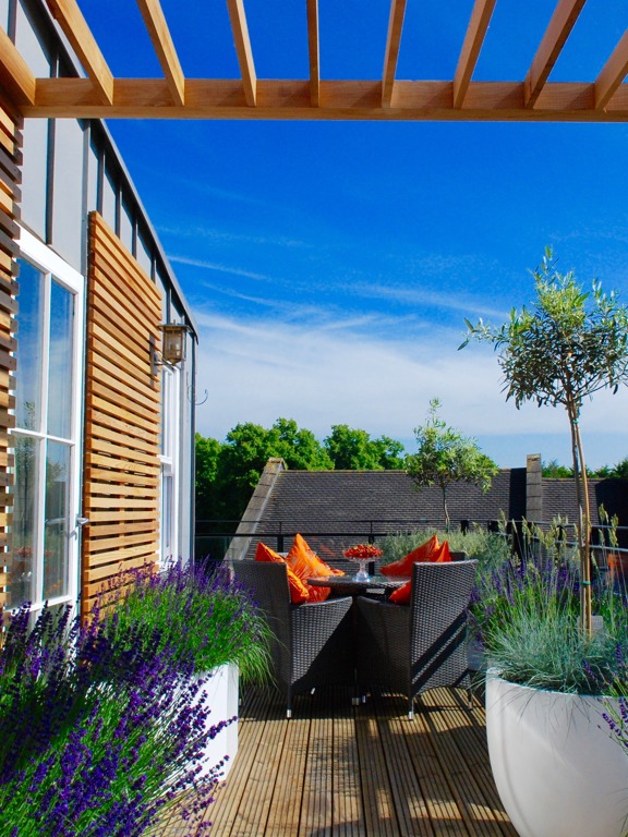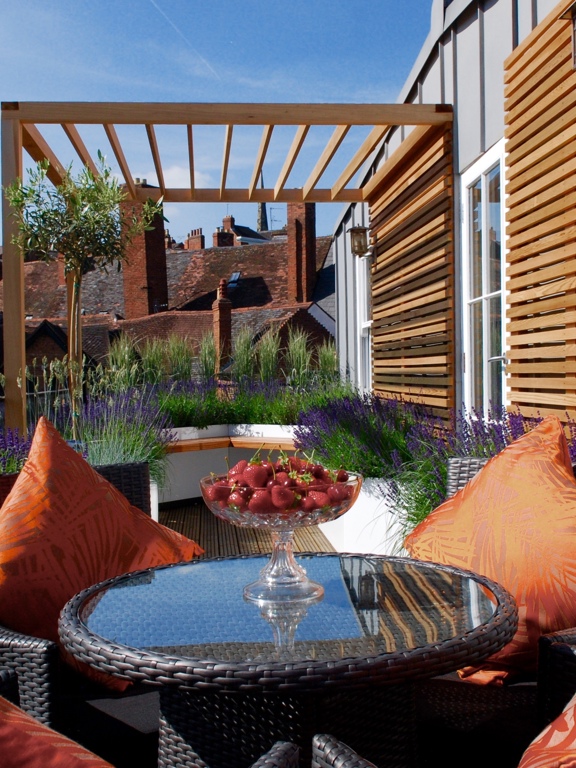 Sitting four floors above the streets of Medieval Shrewsbury this tiny roof terrace was the only outside space available to the owners of a modern penthouse apartment. A bleak empty oblong, just 9m x 2.5m the first time I saw it, but with high expectations from the clients, as a place they could relax and entertain.
