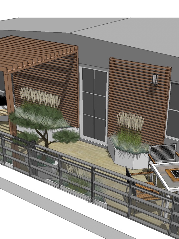 A second space, which included a table and chairs, created a comfortable outdoor dining area for four people. Potted olive trees added height to this part of the garden, with the addition of cedar cladding, echoing that on the pergola. Simple lighting attached to the outside wall of the apartment meant that this was a space that could be enjoyed night time too.